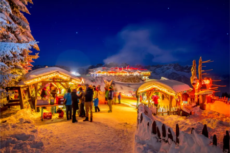Een sfeervolle kerstmarkt met kraampjes, glühwein en livemuziek rond de muziekkiosk. Hier proef je echte Tiroler kerstgezelligheid.